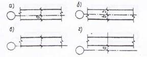 Рис.З а) двусторонняя привязка; б) центральная привязка; в) односторонняя привязка; г) односторонняя привязка с зазором. • Вычерчивание оконных и дверных проёмов (рисунок 4 г). Условные обозначения оконных и дверных проёмов: оконные проёмы: без четвертей с четвертями