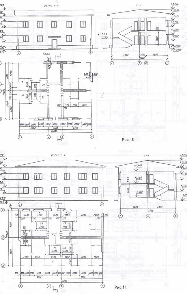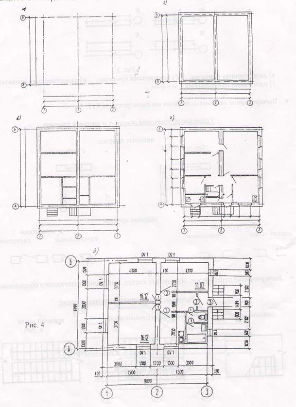 • Нанесение размеров (рис. 4 г). Размеры на планах проставляются в миллиметрах. Наружные размеры наносят в виде трёх цепочек. Первая цепочка чертится на расстоянии 15-20 мм. от контура здания, наносят размеры оконных и дверных проёмов. Вторая размерная цепочка чертится на расстоянии 8 - 10 мм. от первой цепочки - расстояния между координационными осями, привязка наружных стен. Третья размерная цепочка чертится на расстоянии 8-10 мм. от второй цепочки, указывается 1асстояпие между крайними координационными осями. Три размерных цепочки обычно чертят на планах кирпичных зданий. На планах промышленных зданий: на первой размерной цепочке указывают размер шага колонн, нa второй - расстояние между крайними координационными осями (6000 X 9 = 54000мм.) Внутренние размеры наносят в виде одной, двух горизонтальных и одной, двух вертикальных замкнутых размерных цепочек. На них указывают размер комнаты в чистоте, т е. расстояние от стены до стены, толщину стен, перегородок, привязки к координационным осям. •Обводка плана здания. S - 1 мм. - стены наружные и внутренние, несущие и самонесущие, S /2 - перегородки, лестницы, оборудование, окна, двери, площадки (0, 5 мм). S / 3 - размерные и выносные линии, координационные оси (0, 3 мм) •В правом нижнем углу помещения наносят размер площади помещения 7 размером шрифта. Площадь указывают в кв. м. без записи размерности, с указанием двух знаков после запятой, подчёркивают сплошной основной линией, толщиной S. •На плане здания, вдоль наружных стен ставится марка оконных проёмов: OKI, ОК2, ОКЗ и т.д. Марка дверных проёмов ставится в кружок о 5 мм. который обводится линией S/3(рис. 4 д). • Планы подписываются: «ПЛАН 1 ЭТАЖА», «ПЛАН 2 - 9 ЭТАЖЕЙ» «ПЛАН НА ОТМ. 0.000» - для планов промышленных зданий, высота букв 10 мм. Фасады вычерчиваются в масштабах 1: 50, 1: 100, 1: 200, над планом этажа в проекционной связи Последовательность вычерчивания фасада здания. •Вычерчивание уровня земли. •Вычерчивание крайних координационных осей. •Вычерчивание контура здания, с учётом высотных отметок проемы (окна, двери) Вычерчивание оконных и дверных проёмов, соблюдая проекционную связь с планом. •Нанесение размеров. Размеры наносят только в метрах. Проставляют следующие высотные отметки: уровень земли, цоколя, низа и верха оконных и дверных проёмов, кровли, козырьков, балконов. •Обводка фасада. Контур фасады обводится тонкой сплошной линией S / 2, оконные переплёты и координационные оси - линия толщиной S/3, линия грунта -сплошная основная утолщённая - 1.5 S.