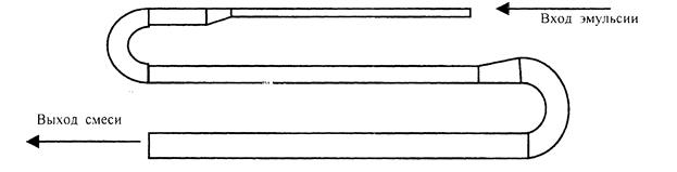 Каплеобразователь. Для доведения ПАВ до капелек пластовой воды и разрушения бронирующих оболочек на их поверхности применяют каплеобразователи. Вход эмульсии Выход смеси Каплеобразователь изготовляют из обрезков труб разного диаметра и располагают на опорах горизонтально. Диаметры отрезков труб увеличиваются от секции к секции в направлении движения обрабатываемой эмульсии. Первая секция - массообменная - предназначена для разрушения оболочек на каплях пластовой воды и укрупнения их за счет турбулентности потока (Re ~- 18000-25000). Длина секции 200-250 м. Вторая секция - для коалесценции капель воды до более крупных размеров при снижении турбулентности потока