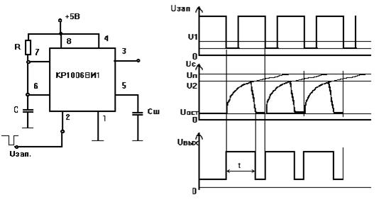 Таймер, включенный по схеме одновибратора, изображен на рисунке 2.3. Упрощенная схема одновибратора и временные диаграммы его работы представлены и на рисунке 2.4.