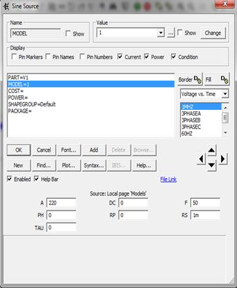Первоначально необходимо задать имя модели в строке Model. После чего в нижней части окна ввести значения, взятые из таблицы 2.1 в поля А (амплитуда) и F (частота). На рисунке 2.2 установлены значения 220 В и 50 Гц, соответственно. Так же из таблицы 2.1 взять имя диода и значение сопротивления R1, которые аналогично выбрать в диоде D1 и ввести в поле value в резисторе R1.