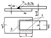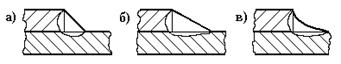 Рис. 6.3. Конструктивная схема сварного соединения внахлёстку По форме поперечного сечения угловые сварные швы делятся на нормальные швы с сечением в виде равнобедренного треугольника (рис. 6.4, а), удлиненные с соотношением катетов 1: 1, 5 или 1: 2 (рис. 6.4, б) и вогнутые с соотношением катетов 1: 1 и более (рис. 6.4, в).