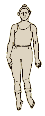 Встанем во весь рост, выпрямимся, расправим плечи. Сохраняя прямую осанку, переместим тяжесть тела на боковую сторону правой стопы и внутреннюю сторону левой стопы. Подошва правой стопы обращена к левой стопе, а подошва левой стопы обращена вовне. Максимально сгибаем голеностопные суставы.