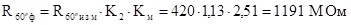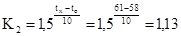 Пример Измерение R60” производится по схеме ВН - НН, бак. Данные заводского протокола: измерено на трансформаторе при tо = 58°С сопротивление изоляции обмоток R60” = 1300 МОм; измерен в лаборатории при tм1 = 20°С тангенс угла диэлектрических потерь масла tg dм1 = 0, 15 %. Данные протокола испытаний на монтаже: R60”изм = 420 МОм при температуре tx = 61 °С и tg dм2 = 2, 5 % при температуре tм2 = 70 °С. Расчет фактического значения сопротивления изоляции 1). Определим коэффициент К2, учитывающий влияние на значение сопротивления изоляции обмоток различия в температурах изоляции при заводских и монтажных испытаниях характеристик изоляции: