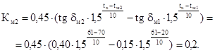 2. Определим значение вычитаемого Км2, учитывающего влияние на значение tg d изоляции обмоток различия в значениях tg d масла при заводских и монтажных испытаниях характеристик изоляции: