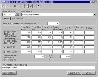 Обязательно вводится " Дата проведения испытания". Пользователь вводит также " Температуру верхних слоев масла", величины " Тангенса угла диэлектрических потерь (tgd) изоляции", значение " Тангенса угла диэлектрических потерь (tgd) масла", температуру, при которой производилось измерение tgd масла, и значения сопротивления изоляции R15 " и R60 " . Для трехобмоточного трансформатора значениями сопротивлений R15 " , и R60 и tgd изоляции заполняются все строки таблицы, а для двухобмоточного - только первые три. Значения R60 " , приведенного к базовой температуре измерения и к базовому значению tgd масла, а также " Коэффициент абсорбции (Kабс)" вычисляются при выполнении экспертизы и заносятся в соответствующие поля формы. Литература 1. Филиппишин В.Я., Туткевич А.С. Монтаж силовых трансформаторов.- М.: Энергоиздат, 1981. 2. Справочник по наладке электроустановок и электроавтоматики. Киев.: " Наукова Думка", 1972. 3. Алексенко Г.В., Ашрятов А.К., Веремей Е.В., Фрид Е.С. Испытание мощных трансформаторов и реакторов, часть 2.- М.: Энергия, 1978. 4. Аншин В.Ш., Худяков З.И. Сборка трансформаторов и их магнитных систем. - М.: Высшая школа, 1985. 5. Нормы испытания электрооборудования. Под общей редакцией С.Г. Королева. - 5-е издание. - М.: Атомиздат. - 304 с. 6. РД 16.363 - 87. Трансформаторы силовые. Транспортирование, разгрузка, хранение, монтаж и ввод в эксплуатацию. 7. Сви П. М. Контроль изоляции высокого напряжения. - М.: Энергоатомиздат, 1988. 8. Каганович Е. А., Райхлин И. М. Испытание трансформаторов мощностью до 6800 кВА и напряжением до 35 кВ.- М.: Энергия, 1980.
