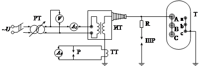 Схема испытания приложенным напряжением изоляции обмоток ВН трехфазного двухобмоточного трансформатора показана на рис. 10.1.
