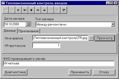 Обязательным для занесения является поле " Дата замера". В строке " Имя файла" указывается имя и полный путь нахождения файла, содержащего термограмму трансформатора. Команда " Просмотр" позволяет перейти в режим детального просмотра изображения трансформатора. Внешний вид окна режима увеличения приведен на рис11.6.