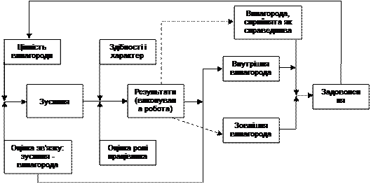 Рис. 2. Модель мотивації в теорії очікувань Якщо немає прямого зв'язку між затраченими зусиллями і досягнутими результатами, то мотивація послаблюється. У разі, коли людина не буде відчувати чіткого зв'язку між досягнутими результатами і бажаною винагородою, мотивація праці також буде послаблюватися. Невпевненість в адекватній винагороді за результати не стимулює трудові затрати. Знижується мотивація працівника і тоді, коли досягнуті результати адекватно винагороджуються, але працівник не може їх досягти за умови розумних затрат. У теорії очікувань задоволення (незадоволення) від винагороди має важливе значення. У зв'язку з тим, що працівники різняться за потребами, можливостями затрат на досягнення результату, то конкретну винагороду вони оцінюють по-різному. Отже, завдання мотивації персоналу полягає в тому, щоб зіставляти і привести у відповідність запропоновану винагороду з результатами. Теорія справедливості виходить з того, що працівник не тільки суб'єктивно оцінює винагороду відповідно до затрачених зусиль, а й порівнює її з винагородою інших працівників, які виконують аналогічну роботу. Якщо внаслідок такого порівняння працівник бачить несправедливість або йому так здається, то в нього виникає психологічне напруження, знижується мотивація до праці. Відчуття справедливості винагороди можна відновити або за рахунок зменшення затрачених зусиль, або за рахунок підвищення винагороди. Дослідження показують, що ті працівники, які вважають, що їм переплачують, намагаються підтримати інтенсивність праці на досягнутому рівні або збільшують її. Ті працівники, які вважають, що їм недоплачують, починають працювати менш інтенсивно.