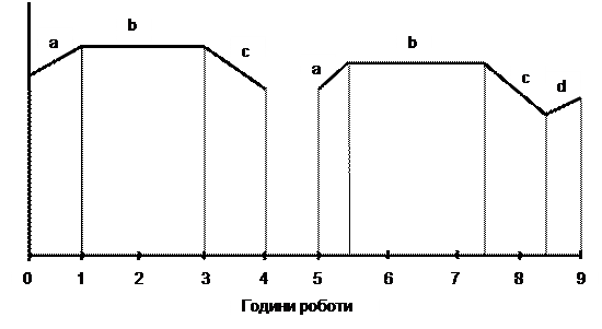 Рис. 4. Типова крива працездатності протягом робочої зміни: a - впрацювання; b - стійка працездатність; c - зниження працездатності; d - емоційний порив