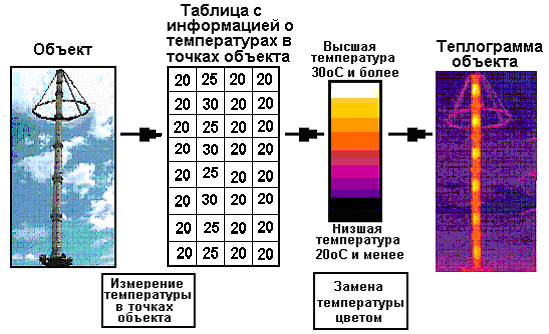 Жылулық диагностика (инфрақ ызыл диагностика) – бұ л электр жабдық тың диагностикасындағ ы дамудың ең ү лкен дә стү рлі ә діспен сынаумен салыстырғ анда жақ сы жағ ы жә не артық шылығ ы бар перспективті жә не эффективті бағ ыты, атап айтқ анда: · алынғ ан мағ лұ маттың анық тығ ы, ақ иқ аттығ ы, нақ тылығ ы, · жабдық қ а тексеру жү ргізу кезіндегі қ ауіпсіздік, · жабдық ты ажыратуды талап етпейді, · жұ мыс орнын дайындауды талап етпейді, · уақ ыт бірлігінде жұ мыс орындаудың ү лкен кө лемділігі, · ерте даму сатысында ақ ауды анық таудың мү мкіндігі. Жылулық диагностика бойынша жұ мыс принципі. Алдымен, жабдық тыжылулық бақ ылауғ а ө тпес бұ рын, арақ ашық тық та объектілер температурасын ө лшеу негізгі принципін қ арастырамыз. Барлығ ына температура ө лшеуші ретінде, тікелей тү йіспе кезінде объектінің температурасын ө лшеуші термометр белгілі. Егер объектінің температурасын ө лшеу қ ажет болса, тікелей тү йіспе қ ауіпті немесе мү мкін емес (Ә Ж оқ шауламасының гирляндасы), тү йіспелі термометр жарамсыз. Мұ ндай ө лшемге пирометр қ ажет. Пирометр объектінің температурасын ә р объектінібелгілейтін инфрақ ызыл сә уле кү шімен анық тайды. Инфрақ ызыл сә уле объектив арқ ылы пирометрдің сә уле кө зінің пропорционалды температурасында кернеу беретін сезімтал элементіне тү седі. Пирометрдің электронды тү рлендіргіштері дисплейде температураның сандық мә нін шығ арады. Пирометр температураны тек қ ана объектінің анық талғ ан нү ктесінде ғ ана ө лшейді. Температураның тарау бейнесін алу ү шін барлық объект (трансформатор) бойынша кө лденең жә не тігінен тез жә не автоматты тү рде аударатын сезімтал элемент, тепловизор талап етіледі. Тепловизордың жедел жады объектінің ә р ұ яшығ ының бір нү ктесінде температура туралы ақ парат табылатын жол жә не бағ аннан қ ұ рылады (1.1- сурет). 1.1- суретте кестенің ө лшемі жең ілдетіліп кө рсетілген. Шындығ ында, тепловизор ұ яшығ ының саны? есе кө п. Мысалы, ThermaСAM Е2 тепловизорында кестенің ө лшемі 160х120 ұ яшық қ а қ алыптастырылады. Тепловизордың жедел жадында температура туралы ақ парат жазылғ аннан кейін объектінің нү ктесінде температурадан қ аншалық ты жоғ ары болса, соншалық ты ашық ө зіндік тү стері бар, темперетурамен анық талғ ан бейне пайда болады. Бейне сұ йық кристалды дисплейге беріледі. Бұ л объектінің табиғ и бейнесін еске тү сіретін, жасанды болып табылатын, шынайы объекті нү ктесінің температурасы бойынша қ ұ рылғ ан бейне. Тепловизорда компьютерлі жұ мысшымен байланыстың болуы алынғ ан ақ партты JPEG форматында сақ тауғ а мү мкіндік береді. Қ арастырылғ ан 1.1-суретте объектінің температурасы диапазон жағ дайында 10°С (20... 30°С) қ ұ райды. Тү стік палитрада 10 тү с бар болсын: бірінші тү с (тө менгі) қ ара, екінші тү с (келесі тө менгі) ең ашық оныншы тү с (жоғ арғ ы) -ақ. 20-дан 21°С-қ а дейін температуралы объектінің барлық нү ктесі қ ара тү спен боялады. 21-ден 22°С-қ а дейін температуралы нү ктелер екінші тү спен, 29-дан З0°С-қ а дейін температуралы нү ктелер оныншы ақ тү спен боялады. Мұ ндай бояулар тепловизорда салынғ ан арнайы бағ дарламамен орындалады.