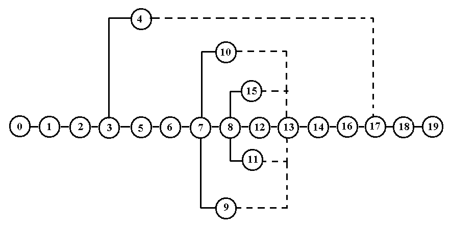2.3-сурет Трансформатордың кү рделі жө ндеуінің типтік технологиялық ү рдісінің тораптық моделі: 1 – жө ндеуге дайындық; 2 – сө ндіру (шинадан ажырату); 3 – салқ ындату жү йесін демонтаждау; 4 – салқ ындату жү йесін жө ндеу; 5 – трансформаторды жө ндеу алаң ына жеткізу; 6 – трансформатордың кү юі; 7 – енгізулерді жә не арматураларды демонтаждау; 8 – трансформаторды жару; 9 – енгізулерді тексеру жә не жө ндеу; 10 – арматураларды жө ндеу; 11 - бакты жө ндеу; 12 – белсенді бө лікті тексеру жә не жө ндеу; 13 - трансформатор жинағ ы; 14 - трансформатор майын қ ұ ю; 15 – ауыстырып қ осқ ыш қ ондырғ ыны жө ндеу; 16 – трансформаторды тексеру жә не кү юі; 17 - трансформаторды қ ондырғ ы орнына ауыстыру; 18 - трансформаторды іргетаста монтаждау; 19 – қ орытындылаушы жұ мыстар