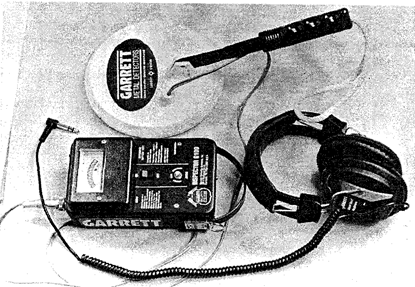 Рис. 2. Металлоискатель. Поиск тайников производится путем простукивания молотками, а также с использованием щупов, буров, металлоискателей. Для просвечивания деревянных стен, мебели, других преград используются переносные рентгеновские установки, кирпичных и железобетонных преград — радиоизотопные отражательные толщиномеры. Изучаются возможности применения для поиска тайников с неметаллическими вложениями приборов, работающих на основе звуковой локации, емкостного метода, метода сверхчастотных колебаний (радиоволн), акустической голографии. Трупы и их части обнаруживают приборами типа " Поиск", принцип действия которых основан на измерении концентрации в почве и в воздухе сероводорода, возрастающей вблизи трупа. С этой целью используют также электрощупы, поскольку электропроводность грунта вблизи трупа значительно возрастает. В водоемах их поиск осуществляют с помощью крючьев и специальных тралов. В настоящее время ведутся работы по изготовлению видеоинтраскопических приборов, дающих возможность воспринимать на экране изображения объектов, находящихся в полужидких, сыпучих и твердых средах, на основе ультразвука, радиоактивного излучения и др. Для выявления объектов биологической природы (крови, спермы, слюны и пр.) используются лупы с подсветкой (увеличение не менее чем в 3, 5 раза), осветительные приборы (осмотр в косопадающем свете может существенно повысить эффективность поиска следов), переносные источники ультрафиолетового излучения. Выявление следов крови и спермы возможно и с применением некоторых реактивов, например, в реакции с гемоФАНом или реактивом Воскобойникова, которые наносятся на край пятна, похожего на кровь. Синее окрашивание является положительной реакцией. Следы крови в труднодоступных местах, больших помещениях, подвалах, чердаках выявляют опрыскиванием подозрительных поверхностей люминолом, вызывающим при попадании на кровь кратковременное свечение. Помещение при этом затемняется. Наличие следов спермы устанавливается с помощью специальной подложки, пропитанной реагентом " фосфотест". При положительной реакции через 20 сек. подложка окрашивается в фиолетовый цвет. Для обнаружения микрообъектов (микрочастиц, микроследов) используются лупы с подсветкой, микроскопы, ультрафиолетовые осветители, ЭОПы. Металлические микрочастицы обнаруживают с помощью небольших постоянных магнитов. Маркировка изделий (главным образом частей автотранспортных средств) проверяется с использованием наборов зеркал на длинных ручках с подсветкой, ультразвуковых дефектоскопов и толщиномеров, датчиков, фиксирующих изменение магнитной проницаемости металла в месте перебивки номера. Возможно также химическое травление поверхности изделий. Помимо перечисленных выше технических средств при расследовании преступлений часто возникает потребность в электроизмерительных приборах (тестеры, измерительные клещи, индикаторы напряжения), например, при расследовании уголовных дел, связанных с авариями, пожарами и взрывами. Используются также газоанализаторы, пирометр, специальные сита для просеивания пожарного мусора. Дефекты в металлоконструкциях выявляют с помощь различных дефектоскопов и переносных рентгеновских дифрактометров. Тепловые следы на местах происшествий, показывающие, например, тр
