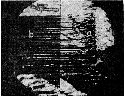 Рис. 10. Отождествление орудия по следам взлома. Справа — трассы, оставленные инструментом (плоскогубцы) на металлической дверной накладке для навесного замка, слева — экспериментальный след, оставленный проверяемыми плоскогубцами.