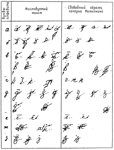 Методика судебно-почерковедческой экспертизы предусматривает четыре стадии исследования: предварительную; раздельную; сравнительную; оценки результатов и формулирования выводов. На первой стадии происходит знакомство эксперта с вещественными доказательствами и вопросами, которые перед ним поставлены, определяется достаточность представленных образцов, выявляется наличие изменений, внесенных в исследуемый документ (подчисток, дописок и т. п.) в целях дальнейшего использования данного документа для проведения технико-криминалистического исследования. Вторая стадия предусматривает раздельное изучение документа — вещественного доказательства и образцов для сравнительного исследования, выявление общих и частных признаков как письменной речи, так и почерка. Встретившиеся в рукописи варианты письменных знаков и их сочетаний с разметкой установленных особенностей частных признаков почерка заносятся в специальные таблицы-разработки (рис. 9). На стадии сравнительного исследования выявленные признаки сопоставляются; результаты сравнения (совпадения или различия) заносятся в таблицы и разработки. Четвертая стадия сводится к оценке индивидуальной совокупности выявленных признаков, позволяющих прийти к выводу о наличии или отсутствии индивидуального тождества. В том случае, если исследуемая рукопись выполнена с преднамеренным искажением почерка, работа эксперта усложняется. В случае намеренного изменения почерка искажению подвергаются главным образом общие и тесно связанные с ними частные признаки. Тем не менее полностью изменить свой почерк пишущему не удается, в нем в достаточной для идентификации степени отображаются частные признаки почерка. Признаки изменения почерка и подписи. Виды намеренного изменения почерка различают по способу маскировки и его разновидностям. Изменение наклона — в большинстве случаев наклон письменных знаков меняется с правого на левый или на вертикальное положение, резке — с вертикального положения или левого наклона на правый. Это снижает уровень координации движений, изменяет разгон, связность и частные признаки почерка. Изменение общих признаков и сочетаний, т. е. размера букв и их элементов. При увеличении размера букв уменьшается разгон; при уменьшении размера почерк становится более размашистым. Изменение строения и частных признаков, т. е. конструктивной сложности почерка и других сопутствующих этому общих и частных признаков. Следует помнить, что последовательно (на протяжении всей рукописи) изменить частные признаки невозможно. Изменение способа держания пишущего прибора. Перемена пишущей руки (непривычное леворучное письмо). Леворучный почерк при отсутствии навыков представляет собой своеобразно искаженный (в большей или меньшей степени) обычный почерк: изломы овальных и вертикальных штрихов, неравномерность расположения букв относительно горизонтальной строки. В этом случае на экспертизу представляются образцы, выполненные как правой, так и левой рукой. Подражание буквам печатной формы, или стилизованное письмо (письмо специальными шрифтами). В этом случае наблюдается, замедленный темп, отсутствуют признаки скорописи. В качестве образцов почерка представляются рукописи, выполненные буквами печатной формы. Подражание маловыработанному почерку сопро