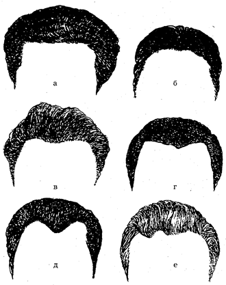 Рис. 4. Линия роста волос: а — прямая, б — дугообразная, в — извилистая, г — ломаная, д — М-образная, е — асимметричная.