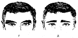 Рис. 11. Размер (ширина) бровей: а — средние, б — широкие, в — узкие, г — расширяющиеся к вискам, д — сужающиеся к вискам. Объективными источниками являются и отображения элементов человека (слепок с лица трупа, слепок следа босой ноги, отпечатки пальцев и т. п.), а также костные останки, череп. Объективным может быть признано и, описание по методу словесного портрета, составленное по всем правилам в условиях непосредственного целенаправленного восприятия фиксируемого лица. Оценка информации из субъективных источников требует особого подхода. Формирование мысленного образа искомого лица в памяти человека — это сложный психофизиологический процесс. Он складывается из нескольких этапов, каждый из которых способен повлиять на достоверность информации. Основными из этих этапов являются: восприятие, запоминание, воспроизведение. Восприятие внешнего облика может быть длительным, неоднократным, в том числе и при благоприятных условиях, способствующих запоминанию
