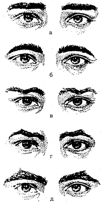 Рис. 12. Форма (контур) бровей: а — прямые, б — дугообразные, в — извилистые, г — ломаные, д — треугольные.