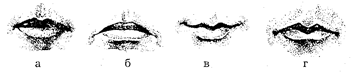Рис. 21. Контур линии смыкания губ: а — линия прямая, б — дугообразная, в — волнистая, г — ломаная.