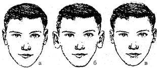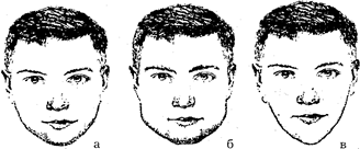 Рис. 17. Глубина переносицы: а — средняя, б — большая, в — малая.