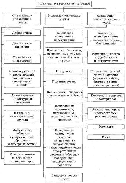 добровольно сданного огнестрельного оружия, дактилоскопический учет и др. Различают две категории' объектов регистрации: носители криминалистической информации и источники последней. Эти объекты могут регистрироваться отдельно, например: учет неизвестных преступников по отпечаткам пальцев рук (объект — источник информации) и учет следов рук, изымаемых с мест нераскрытых преступлений (объект — носитель информации), или будучи одновременно и источниками, и носителями информации, составлять единый учет, как, например, учеты неопознанных трупов, похищенных вещей, поддельных денежных знаков. От вида криминалистического учета следует отличать его форму, т. е. способ накопления регистрируемой информации. Наиболее распространенными являются следующие формы учетов: картотеки, коллекции, альбомы, аудио- и видеозаписи, компьютерные базы данных, а также смешанные, например компьютерная база данных, оформленная в виде автоматизированной картотеки, или коллекция, пояснения для которой составлены в виде картотеки, и пр. Для ведения системы криминалистической регистрации используются различные способы, фиксирующие информацию: описательный — алфавитный, по признакам внешности, по способу совершения преступления и пр.; изобразительный (изображение вещей и предметов) — слепки, дактилоскопические карты, фотоснимки, микрокарты, микрофиши, реплики, иные; коллекционный (сбор натурных коллекций объектов-оригиналов и сравнительных образцов) — вещества, материалы, изделия, орудия и следы преступлений и пр.; графический — схемы, чертежи, профилограммы, хроматограммы, спектрограммы, рентгенограммы и пр. Накопление информации производится, как и в любой другой подобной системе, с использованием информационно-поискового языка — искусственного языка, предназначенного для формализованного описания данных и (или) отработки запросов, поступающих в систему. Перевод данных на информационно-поисковый язык осуществляется по определенным правилам в соответствии со словарем поисковых признаков (тезаурусом системы). На практике нередко применяют смешанные формы и способы учетов: рекомендации дополняются альбомами, картотеками; описательный способ сочетается с изготовлением фотоснимков, дактилоскопических карт и т. д. В зависимости от названных способов определяются средства и методы фиксации криминалистической информации от простейших, например средства письма, к более сложным — фотосъемка, микрофильмирование, дактилоскопирование и, наконец, до сложнейших физико-химических методов получения и фиксации информации о признаках объектов учетов. Эффективность использования криминалистических учетов существенно повышается в связи с применением средств автоматизации и вычислительной техники, позволяющих не только во много раз сократить время отработки запросов, но и установить корреляционные зависимости между объектами регистрации. Учение о криминалистической регистрации в своей основе базируется на материалистическом понимании окружающего нас мира, законах диалектики и теории познания. Развитие криминалистической регистрации органически связано с теорией криминалистической идентификации, учениями о механизме следообразования и способе совершения преступлений, о фиксации доказательств. Однако особое значение имеют научн