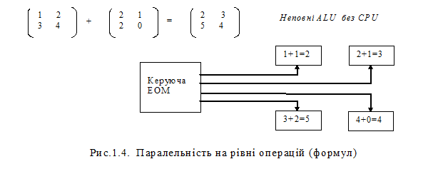Основне застосування процедурного рівня розпаралелення - загальне паралельне оброблення інформації, де застосовується ділення вирішуваної проблеми на паралельні задачі - частини, які вирішуються багатьма процесорами з метою підвищення обчислювальної продуктивності (приклад - рис.1.3.). Рівень формул (арифметичних виразів) Арифметичні вирази виконуються паралельно покомпонентно, причому в суттєво простіших синхронних методах. Якщо, наприклад, йдеться про додавання матриць (рис.1.4.), то операція синхронно розпаралелюється просто тому, що на кожному процесорові обчислюється один (чи кілька) елемент матриці.