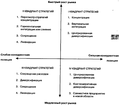 Рис. 1. Матрица Томпсона и Стрикланда Примечание: Стратегии выписаны в возможном порядке предпочтения Интересы и отношение высшего руководства играют очень большую роль в выборе стратегии развития фирмы. Руководство может любить рисковать, а может, наоборот, стремиться любыми способами избегать риска. И это отношение может быть решающим в выборе стратегии развития. Личные симпатии или антипатии со стороны руководителей также могут очень сильно влиять на выбор стратегии. Финансовые ресурсы фирмы также оказывают существенное влияние на выбор стратегии. Любые изменения в поведении фирмы, такие, например, как выход на новые рынки, разработка нового продукта и переход в новую отрасль, требуют больших финансовых затрат. Квалификация работников, так же как и финансовые ресурсы, является сильным ограничительным фактором при выборе стратегии развития фирмы. Не обладая достаточно полной информацией о квалификационном потенциале, руководство не может сделать верного выбора стратегии фирмы. Обязательства фирмы по предыдущим стратегиям создают некую инерционность в развитии фирмы. Невозможно полностью отказаться от всех предыдущих обязательств в связи с переходом к новым стратегиям. Поэтому при выборе новых стратегий необходимо учитывать тот факт, что еще некоторое время будут действовать обязательства прежних лет, которые соответственно будут сдерживать либо корректировать возможности реализации новых стратегий. Степень зависимости от внешней среды оказывает существенное влияние на выбор стратегии фирмы. Бывают такие ситуации, что фирма настолько зависит от поставщиков или покупателей ее продукции, что она не вольна делать выбор стратегии, исходя из возможностей более полного использования своего потенциала. Сильная внешняя зависимость может быть обусловлена также правовым регулированием поведения фирмы, например, антимонопольным законодательством, социальными ограничениями, зависимостью от природной среды, зависимостью от политических факторов и т. п. Временной фактор должен обязательно приниматься во внимание при всех случаях выбора стратегии. Связано это с тем, что и возможности, и угрозы для фирмы, и планируемые изменения всегда имеют определенные временные границы. При этом важно учитывать и календарное время, и временную продолжительность интервалов осуществления конкретных действий по реализации стратегии. Фирма не в любой момент и не в любые календарные сроки может осуществлять стратегию, а только в те моменты и в те сроки, в которые появляется возможность для осуществления стратегии. Оценка выбранной стратегии в основном осуществляется в виде анализа правильности и достаточности учета при выборе стратегии основных факторов, определяющих возможности осуществления стратегии. Вся процедура оценки выбранной стратегии в конечном счете подчинена одному: приведет ли выбранная стратегия к достижению фирмой своих целей. И это является основным критерием оценки выбранной стратегии. Если стратегия соответствует целям фирмы, то ее дальнейшая оценка проводится по следующим направлениям. · Соответствие выбранной стратегии состоянию и требованиям окружения. Проверяется то, насколько стратегия увязана с требованиями со стороны основных субъектов окружения, в какой степени учтены факторы динамики ры