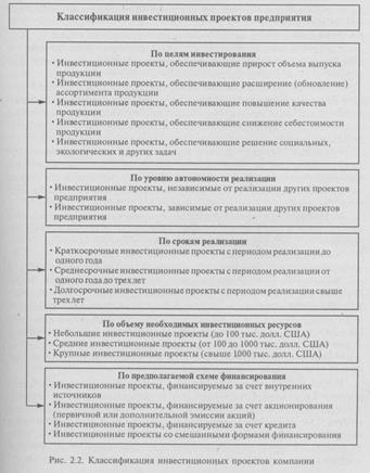 Инвестиционные проекты, разрабатываемые по отдельным формам инвестирования, классифицируются по ряду признаков (рис.): целям инвестирования, уровню автономности реализации, срокам реализации, объему необходимых инвестиционных ресурсов, предлагаемой схеме финансирования. При разработке схемы финансирования инвестиционного проекта рассматриваются следующие варианты: полное самофинансирование, акционирование, кредитное финансирование, лизинг, смешанное (долевое) финансирование. Вложение средств в инвестиционный проект целесообразно, если инвестиционный процесс отвечает следующим критериям: • чистая прибыль от данного вложения превышает чистую прибыль от помещения средств на банковский депозит или прибыль от других вложений; • рентабельность инвестиций выше уровня инфляции; • рентабельность проекта с учетом фактора времени (временной стоимости денег) выше рентабельности альтернативных проектов; • рентабельность активов компании после осуществления проекта будет не ниже необходимого, критического (возможно предпроектного) уровня и превысит среднюю расчетную ставку по заемным средствам (т.е. дифференциал финансового рычага будет положительным); • данный проект соответствует генеральной стратегической линии компании с точки зрения сроков окупаемости вложений, наличия финансовых источников покрытия издержек до начала окупаемости проекта, обеспечения достаточно стабильных поступлений. Указанные критерии не являются исчерпывающими, их выбор субъективен и зависит от преследуемой цели и сложившихся условий. Подготовка бизнес-планов инвестиционных проектов Инвестиционный проект обычно требует разработки бизнес-плана. Бизнес-план — основной документ, разрабатываемый и предоставляемый инвестору по реальному инвестиционному проекту. В нем в краткой форме и общепринятой последовательности разделов излагаются основные характеристики проекта и финансовые показатели, связанные с его реализацией. Целью его разработки и представления является мобилизация инвестиционных ресурсов или получение инвестиционного кредита. Он должен обеспечить эффективность намечаемых инвестиций. Существуют возможности инвестиционного проектирования с применением компьютерной аналитической системы Project Expert (и другие!!!), позволяющей создавать в системе различные инвестиционные проекты и планировать их реализацию, анализировать эффективность и принимать обоснованные стратегические решения по выбору оптимального проекта, контролировать его исполнение. Экспертиза отобранных объектов инвестирования Оценка эффективности инвестиций предусматривает проведение анализа отобранных объектов инвестирования с позиции их экономической эффективности. Для каждого объекта инвестирования используется определенная методика оценки эффективности (см. предмет инвестиционная политика). По результатам оценки проводится ранжирование инвестиционных проектов и финансовых инструментов по критерию их эффективности (доходности). Для реализации принимаются объекты инвестирования, обеспечивающие наибольшую доходность.
