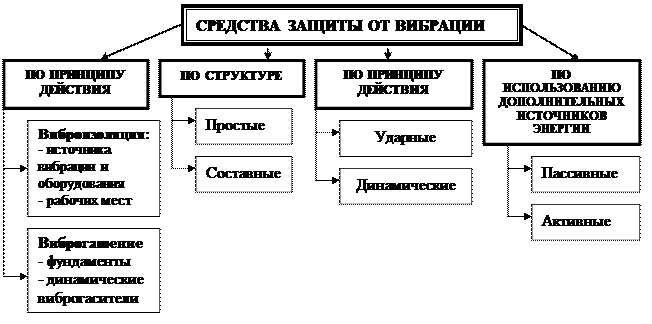 Методы борьбы с вибрацией базируются на анализе уравнений, описывающих колебания машин и агрегатов в производственных условиях. Эти уравнения сложны, т.к. любой вид технологического оборудования (так же как и его отдельные конструктивные элементы) является системой со многими степенями подвижности и обладает рядом резонансных частот. Однако, все средства защиты от производственных вибраций, основываются на перечисленных выше принципах, реализуемых в источнике, на пути распространения вибраций или при защите объекта. В зависимости от объекта защиты, средства, с помощью которых реализуются описанные выше методы, подразделяются на две большие группы: коллективные (4.14) и индивидуальные (4.15).