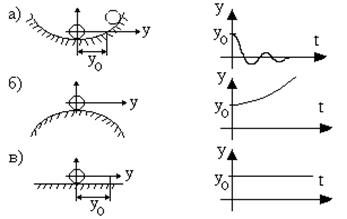 Из анализа изменения координаты y(t) следует: а) y(t)®0 при t®¥, устойчивое положение шарика; б) y(t)®¥ при t®¥, неустойчивое положение шарика; в) y(t)=y0=const при t³ 0, нейтральное или безразличное положение шарика.