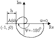 В процессе работы системы ее параметры (коэффициенты передачи и постоянные времени) из-за изменений внешних условий, колебаний напряжений источников энергии и других причин отличаются от расчетных значений. Если не принять определенных мер, то система может стать неустойчивой. Для исключения этого явления при проектировании следует обеспечить определенные запасы устойчивости системы, которые характеризуют близость амплитудно-фазовой частотной характеристики разомкнутой системы к точке с координатами (-1, j0). Запасы устойчивости определяют на двух частотах: частоте среза wс и критической частоте wкр. На частоте среза АЧХ разомкнутой системы равна единице, на критической частоте ФЧХ принимает значение, равное -p. Различают запас устойчивости по амплитуде (модулю) и запас устойчивости по фазе. Запас устойчивости по амплитуде задается некоторой величиной h (рис.5.12, а), на которую должен отличаться модуль АФЧХ разомкнутой системы от единицы на частоте, при которой фаза равняется -1800, т.е.