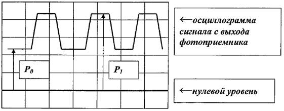 Рис. Л4.4 16.По экспериментальным данным таблицы 1 вычислить значение коэффициента модуляции по формуле: m = (Р1 – Р0)/(Р1 + Р0). 17.По данным таблицы 1 построить зависимость коэффициента модуляции m от тока I0. 18.Исследовать зависимость глубины модуляции лазерного излучения импульсным сигналом от напряжения смещения на фотодиоде Uсм. Для этого повторить измерения коэффициента модуляции для других значений напряжения смещения. Изменять Uсм с шагом, указанным преподавателем. Изменение и контроль величины Uсм проводится с помощью потенциометра и цифрового индикатора на лицевой панели электронного блока ФП. 19.По экспериментальным данным построить зависимость коэффициента модуляции m от напряжения смещения на фотодиоде Uсм для различных токов I0 (значения I0 указываются преподавателем). 20.Установить значение величин I0 и I1 заданных преподавателем. С помощью регулировки вертикального положения сигнала 1 канала (↨) вывести сигнал модуляции на экран. Органы регулировки положения сигнала на втором канале должны при этом оставаться в исходном положении, чтобы не изменилось положение нулевого отсчетного уровня. Зарисуйте осциллограммы модулирующего сигнала, наблюдаемого по первому каналу, и принимаемого фотоприемником сигнала наблюдаемого по второму каналу. На осциллограмме отметить положение нулевого уровня.