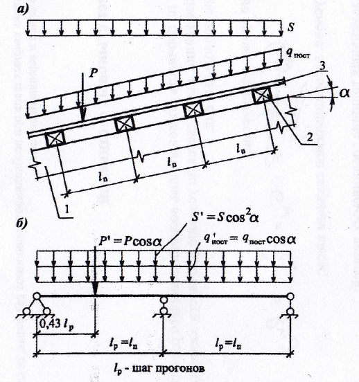 Рис. 4.6. Поперечный настил: а) схема приложения нагрузок; б) расчетная схема (1 – верхний пояс несущей конструкции; 2 – рабочий настил; 3 – защитный косой настил, кровля условно не показаны).