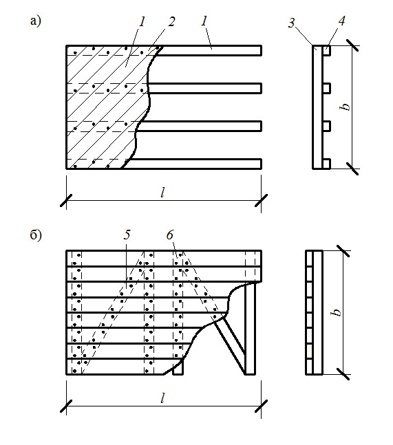 Рис. 4.8. Дощато-гвоздевые щиты настилов покрытий: а) щит двойного перекрестного настила; б) щит однослойного раскосного настила; 1 – доски; 2 – гвозди; 3 – косой защитный настил; 4 – разреженный рабочий настил; 5 – раскосы; 6 – поперечины.