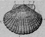 Рис. 1. Приморский гребешок Pecten jessoensis, правая створка раковины: 1 — вершина; 2 - заднее ушке; 3—задний край; 4 — брюшной край; 5 — передний край; 6 — переднее ушко; 7 — спинной край (по А, В. Иванову).