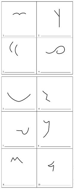 Субтест 2. «Завершение фигуры». Дорисуйте десять незаконченных стимульных фигур. А так же придумать название к каждому рисунку. Субтест 3. «Повторяющиеся линии». Стимульным материалом являются 30 пар параллельных вертикальных линий. На основе каждой пары линий необходимо создать какой-либо (не повторяющийся) рисунок.