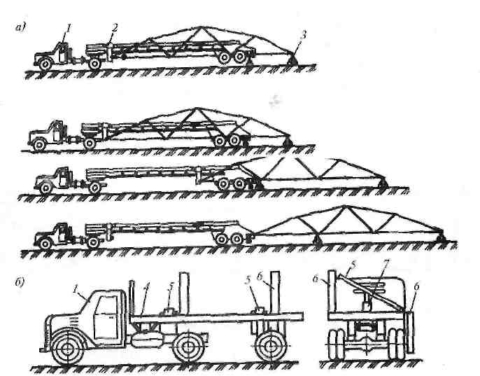 а – схема процесса саморазгрузки; 6 – самосвальный лесовоз; 1 – тягач; 2 – подвижная каретка; 3 – инвентарная подставка; 4 –полуприцеп; 5– опрокидная площадка; 6 – откидная стойка; 7 – домкрат