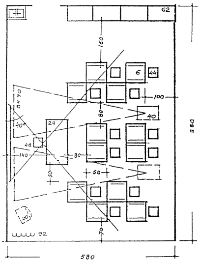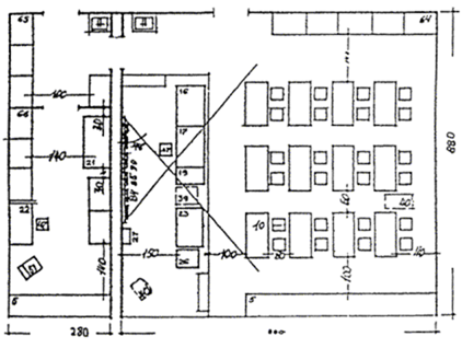 9.1. Основное помещение школы (класс - учебный кабинет (должно отвечать требованиям активного ведения учебного урока с организацией как фронтальных, так групповых и индивидуальных форм обучения с широким привлечением технических средств. Помещение должно включать рабочую зону учащихся, рабочую зону учителя, дополнительное пространство для размещения учебно-наглядных пособий, ТСО, личных вещей учащихся, зону для групповой работы и для индивидуальных занятий учеников (особо успевающих и неуспевающих) и возможности активной деятельности. Эти зоны как сумма пространств должны обеспечивать оптимальные условия обучения. Помещения 1 (8 (9) классов следует оборудовать одноместными легкими ученическими столами и, как правило, встроенными шкафами, а также дополнительным мобильным оборудованием для решения проблем " гибкой" организации пространства с целью активизации форм обучения. *9.2. Проходы и расстояния между оборудованием в основных учебных помещениях (приложение рис. 1 (3) должны приниматься в см.: П1 (между рядами двухместных или спаренных столов не менее 60; П1 (между рядами одноместных столов не менее 50; П2 (между рядами столов и наружной продольной стеной не менее 70; П3 (между рядами столов и внутренней продольной стеной (перегородкой) или шкафами, стоящими вдоль этой стены, не менее 160; П4 (между передними столами и демонстрационным столом не менее 140; Р1 (от передней стены с классной доской до передних столов всех рядов при трехрядной расстановке не менее 280. Р2 (от задних столов до задней стены (перегородки) не менее 160; Р3 (от задних столов до шкафов, стоящих вдоль задней стены (перегородки) (не менее 140; Р4 (между столом преподавателя и передней стеной (перегородкой) (не менее 140; Р5 (между группами столов не менее 140; Д1 (между столами в ряду (не менее 50; Д2 (между столом преподавателя и передними столами учащихся не менее 80; У (наибольшая удаленность последнего места учащегося от классной доски в учебном помещении 860. Высота нижнего края классной доски над полом (в рабочем положении) для 1 классов (70 (80; 2 (4 классов (75 (80; 5 (11 классов (80 (90. Угол рассматривания классной доски принимается не менее 40(.