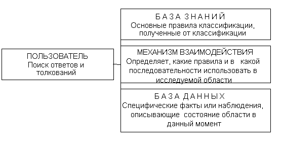 База знаний включает в себя большую сумму знаний относительно проблем, запомненных в системе. Исследователи находят, что использование этой массы знаний более эффективно, чем использование специальных решающих процедур. Экспертные системы являются консультантами в принятии решений, т. к. содержат факты, знания и правила, которые взаимодействуют в проблемной области. Пример общей структуры экспертной системы классификации на основе правил приведен на рис. 31.