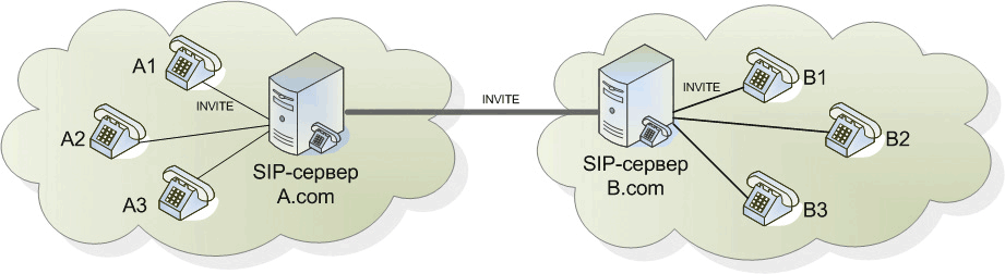 Рисунок 3. Типичная схема использования SIP-прокси-сервера Если пользователь A1@a.com захочет позвонить пользователю B1@b.com, то он передаст запрос INVITE B1 своему прокси-серверу, который перенаправит вызов прокси-серверу b.com абонента B1. Сервер регистрации (REGISTRAR) Перед работой в сети каждое устройство должно зарегистрироваться с помощью специального сообщения REGISTER. При этом клиент сообщает серверу свое имя в формате: IP-адрес, номер порта, SIP-URI и пароль доступа. В случае успешной регистрации информация о клиенте заносится в специальную базу данных (используется в дальнейшем для нахождения клиента) и клиенту высылается сообщение: " 200 OK". С определенной периодичностью этот процесс повторяется, таким образом обеспечивается " актуальность" данных о клиентах. Как правило, серверы REGISTRAR совмещаются с прокси-серверами. PBX Asterisk, рассмотрению которого будет посвящена отдельная статья, в этом отношении не является исключением и может выполнять как функции прокси-сервера, так и сервера регистрации. SCCP (Skinny Client Control Protocol) Данный протокол является корпоративным. Он разработан компанией Cisco Systems для организации работы IP-телефонов Cisco под управлением ПО Cisco Call Manager, являющегося в том числе и шлюзом в сети H.323. Идея подхода, лежащего в основе разработки протокола SCCP, заключалась в переносе логики обработки H.323 соединений из конечных устройств в ПО Cisco Call Manager. Таким образом, существенно упрощалась (и удешевлялась) реализация конечного устройства клиента.
