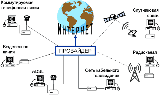 Рис. 2.3. Способы подключения к провайдеру. Способов подключения к оборудованию провайдера достаточно много, это подключение по коммутируемой телефонной линии, по выделенной линии, по цифровой телефонной связи, по сети кабельного телевидения, по спутниковым каналам, по радиоканалу. 1. Наиболее доступным и часто используемым способом подключения к Internet является подключение по обычной коммутируемой телефонной линии (dial-up). Такая линия есть в каждом доме и офисе, а для подключения компьютера к Internet по такой линии необходимо всего лишь одно устройство – это модем. Модем – это специальное устройство, которое соединяет компьютер с телефонной линией. Модемы бывают внутренние и внешние.