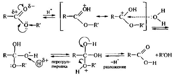 Сложные эфиры вступают в реакции нуклеофильного замещения. 1. Гидролиз сложных эфиров проходит как в кислой, так и в щелочной среде. Кислотный гидролиз сложных эфиров – последовательность обратимых превращений, противоположных реакции этерификации: