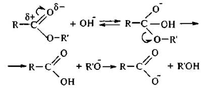 Щелочь выступает не в роли катализатора, а в роли реагента. Гидролиз начинается с нуклеофильной атаки гидроксид-ионом атома углерода карбонильной группы. Образуется промежуточный анион, который отщепляет алкоксид-ион и превращается в молекулу карбоновой кислоты. Алкоксид-ион, как более сильное основание, отрывает протон от молекулы кислоты и превращается в молекулу спирта: