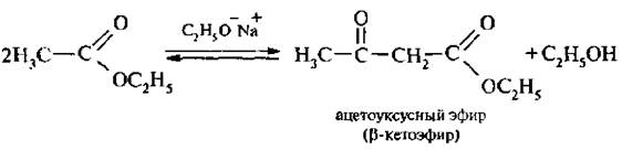 Для смешения равновесия вправо отгоняют более летучий спирт. 4. Сложноэфирная конденсация Кляйзена характерна для эфиров карбоновых кислот, содержащих атомы водорода в α -положении. Реакция протекает в присутствии сильных оснований:
