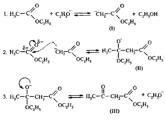 Алкоксид-ион отщепляет протон от α -углеродного атома молекулы эфира. Образуется мезомерно стабилизированный карбанион (I), который, выступая в роли нуклеофила, атакует атом углерода карбонильной группы второй молекулы эфира. Образуется продукт присоединения (II). Он отщепляет алкоксид-ион и превращается в конечный продукт (III). Таким образом, всю схему механизма реакции можно разделить на три стадии: