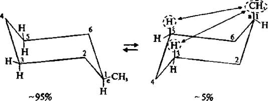 Две конформации «кресла» монозамещенного циклогексана энергетически неравноценны. Более стабильной является конформация с экваториальным положением заместителя. Аксиальное положение заместителя для циклогексана менее выгодно, так как возникает стерическое отталкивание, обусловленное взаимодействием заместителя с аксиально расположенными атомами водорода в положении 3 и 5.