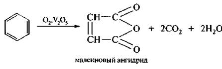 III. Реакции окисления 1. Окисление бензольного цикла. Бензольное кольцо устойчиво к действию окислителей. В обычных условиях ни перманганат калия, ни азотная кислота, ни оксид хрома (VI), ни другие сильные окислители не окисляют бензол. В жестких же условиях, например, при действии кислорода воздуха в присутствии оксида ванадия (V2O5), при температуре 400-500 °С бензольное ядро окисляется, образуя малеиновый ангидрид: