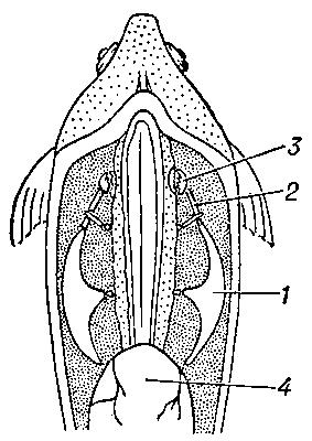 Парные плавники состоят из: 1) поясов плавников; 2) скелета свободного плавника. У круглоротых парные плавники отсутствуют. У хрящевых рыб плечевой пояс представлен хрящевой дугой. В ней выделяют: 1) лопаточную (дорзальную); 2) коракоидную (вентральную) части. Скелет свободной конечности состоит из трех базалий, радиалий, разделенных на 2–3 хрящика, и эластотрихий, поддерживающих кожную лопасть (рис. 4). Тазовый пояс или пояс брюшных плавников у рыб с осевым скелетом не связан. У хрящевых он представлен небольшой хрящевой пластинкой, к которой причленяется скелет брюшного плавника, состоящий из: 1) длинного базального луча; 2) радиалий; 3) плавниковых лучей — эластотрихий. У самцов задние концы базалий и радиалий преобразованы в совокупительный аппарат – птеригоподий.