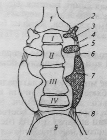 Рис. Веберов аппарат рыбы: 1 - перилимфатический проток; 2, 4, 6, 8 – связки; 3 – стапес; 4 – инкус; 7 – малеус; 9 - плавательный пузырь. Римские цифры - позвонки
