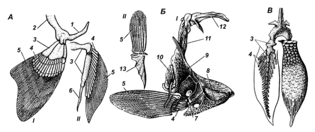 Рис. 4. Скелет плавников А – хрящевая рыба; Б – костистая рыба; В – брюшные плавники бисериального типа; I – грудной плавник с плечевым поясом; II – брюшной плавник с тазовым поясом 1 – лопаточный отдел; 2 – коракоидный отдел; 3 – базалии; 4 – радиалии; 5 – плавниковые лучи; 6 – птеригоподии; 7 – лопатка; 8 – коракоид; 9 – клейтрум; 10 – задний клейтрум; 11 – надклейтрум; 12 – задневисочная кость; 13 – тазовая кость